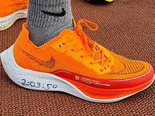 Coach Walter B. Moura ao lado do campeão da São Silvestre 2023, Timothy Kiplagat. O detalhe do seu tênis, o tempo conquistado na Maratona de Rotterdam 2023, consagrando-se vice-campeão da prova.